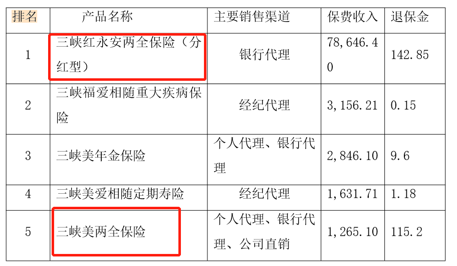 值得注意的是,两全保险一直为三峡人寿保费收入排名第一的产品。2019年,保费收入排名前五的产品中,两全保险便占据了两席。2018年,两全产品占一席。